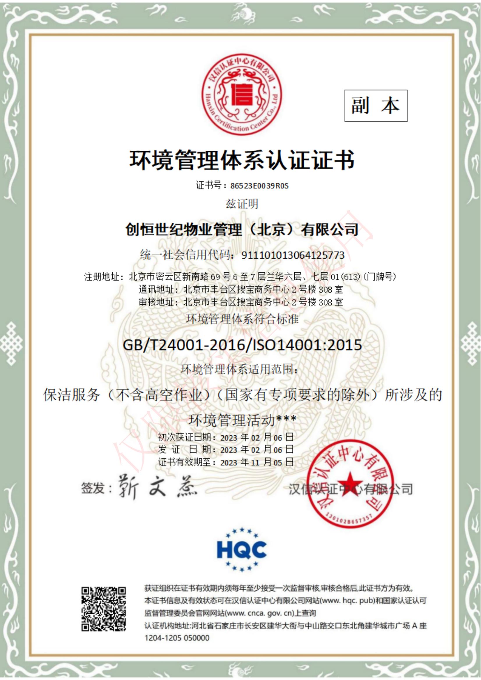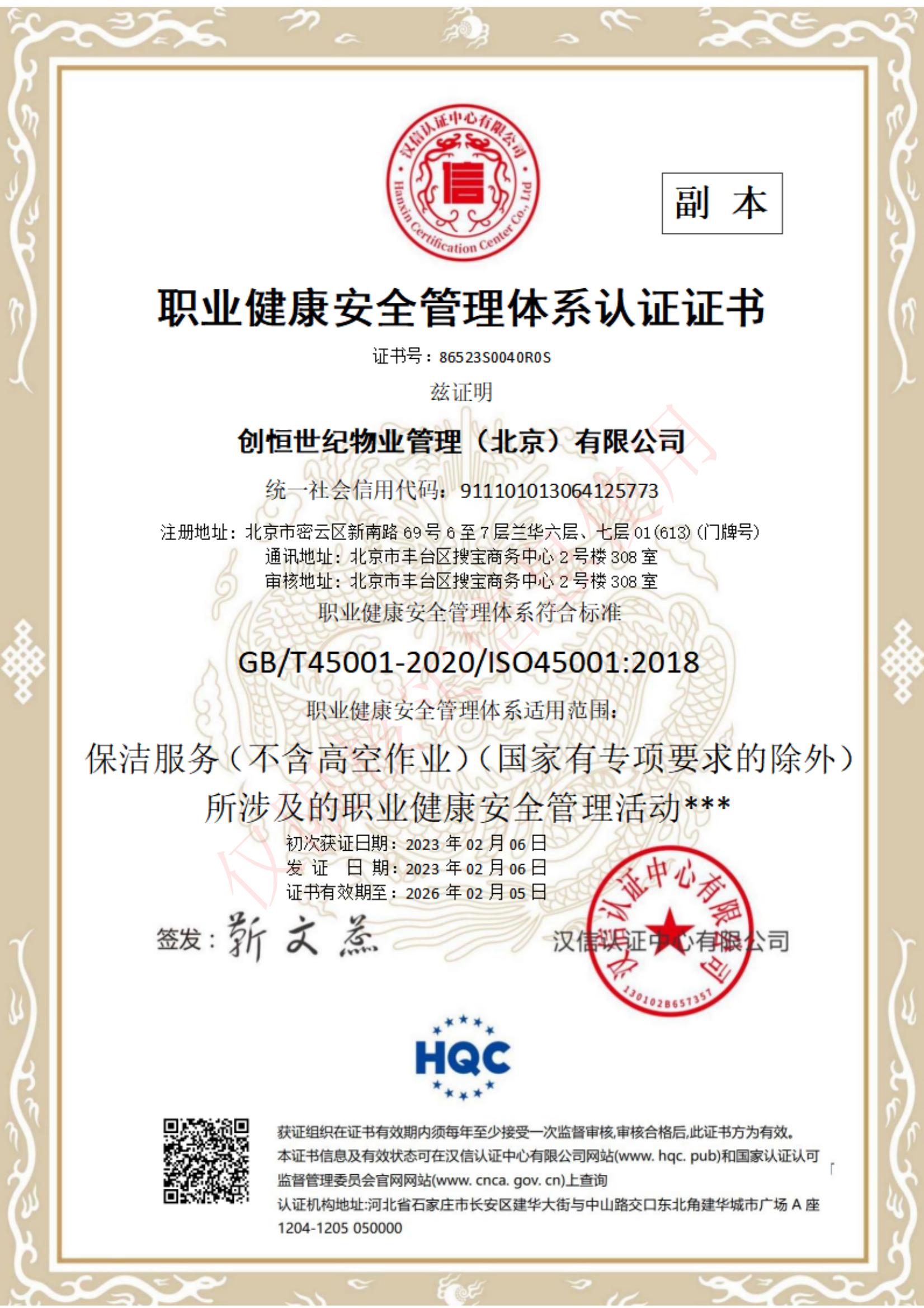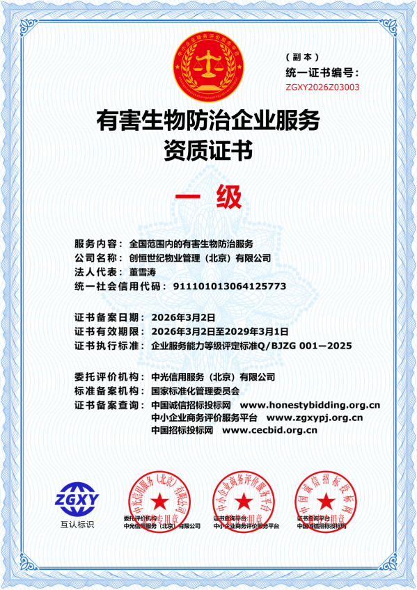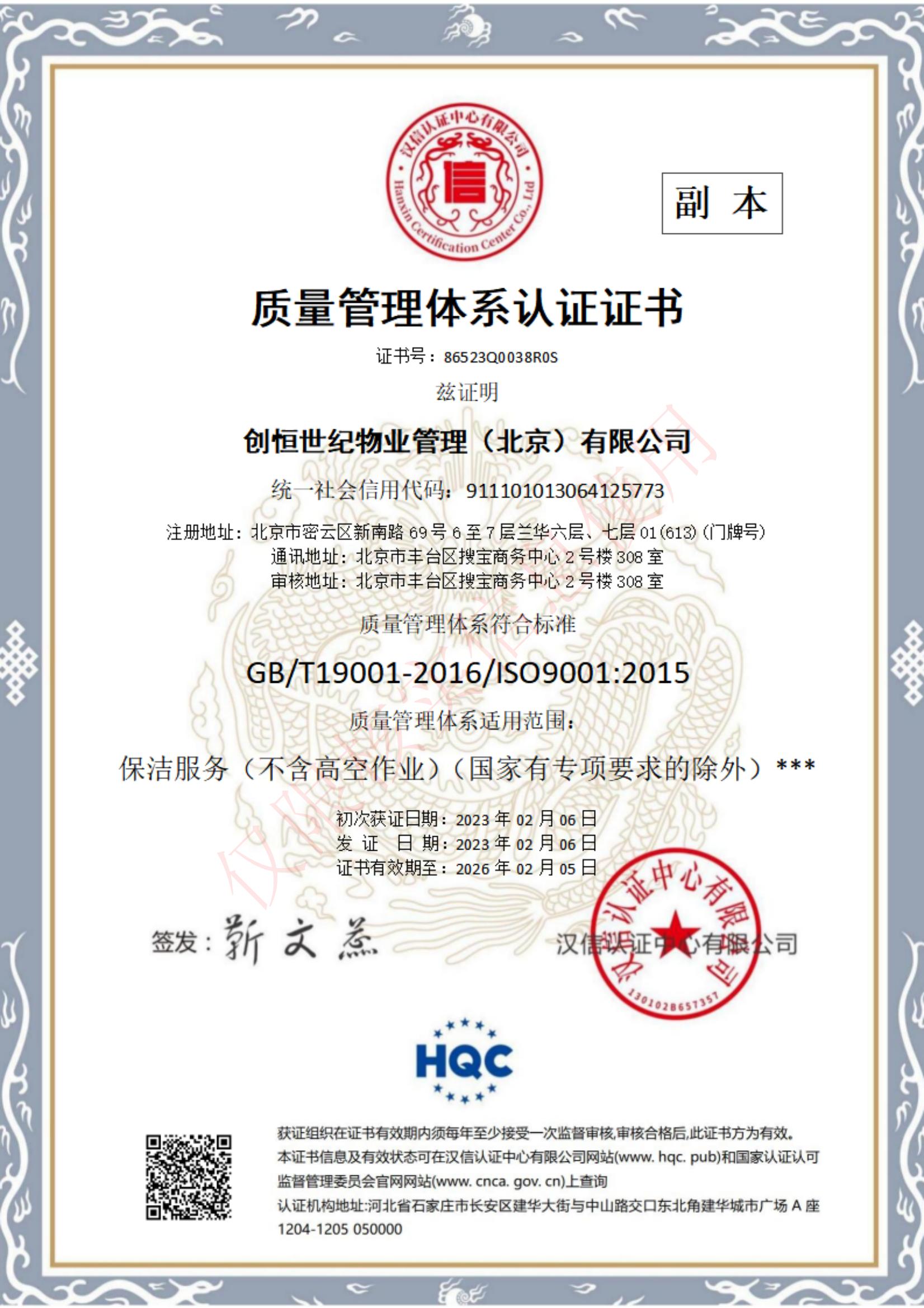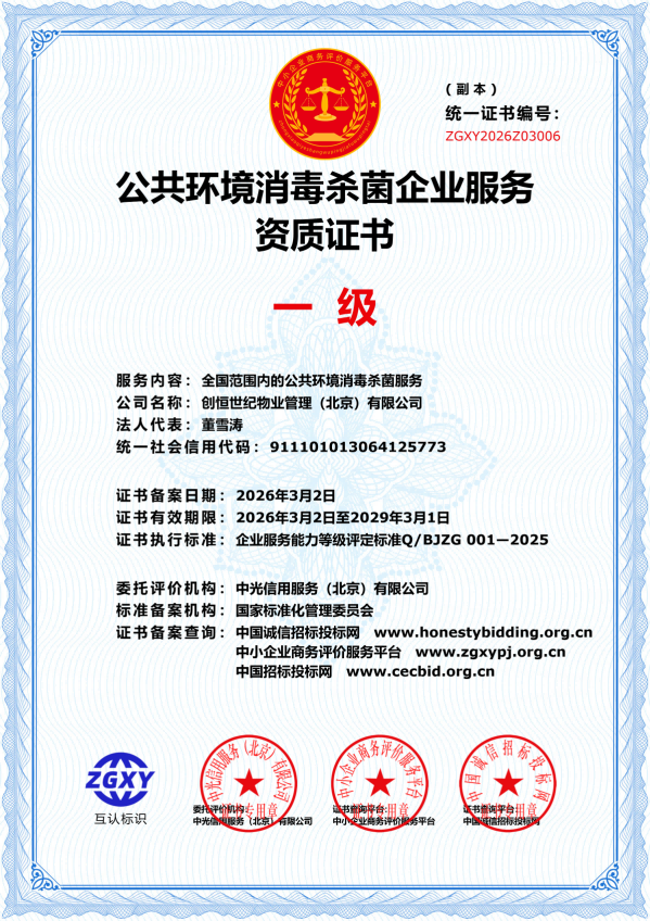 创恒世纪物业管理(北京)有限公司成立于2014年6月,是一家注重现代科技成果转化的保洁服务公司,是北京清洁行业协会的会员单位。为提高物业保洁服务的效率和科技水平,公司为各服务项目先后购置了全自动洗地机,多功能扫地机、全自动地毯清洗机、沙发清洗机、扫地机器人等先进的清洁设备,提高了服务效率、品质与层次。